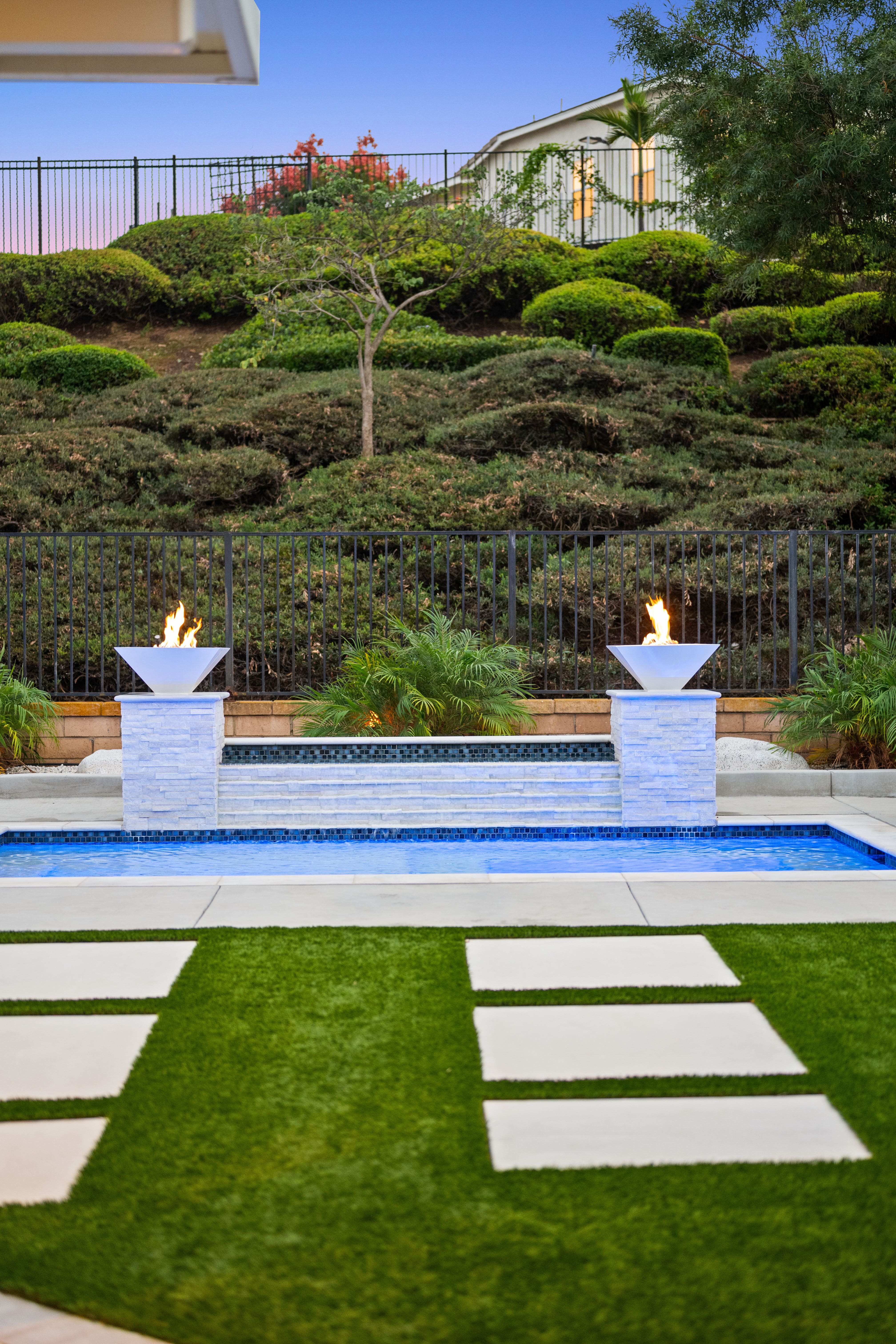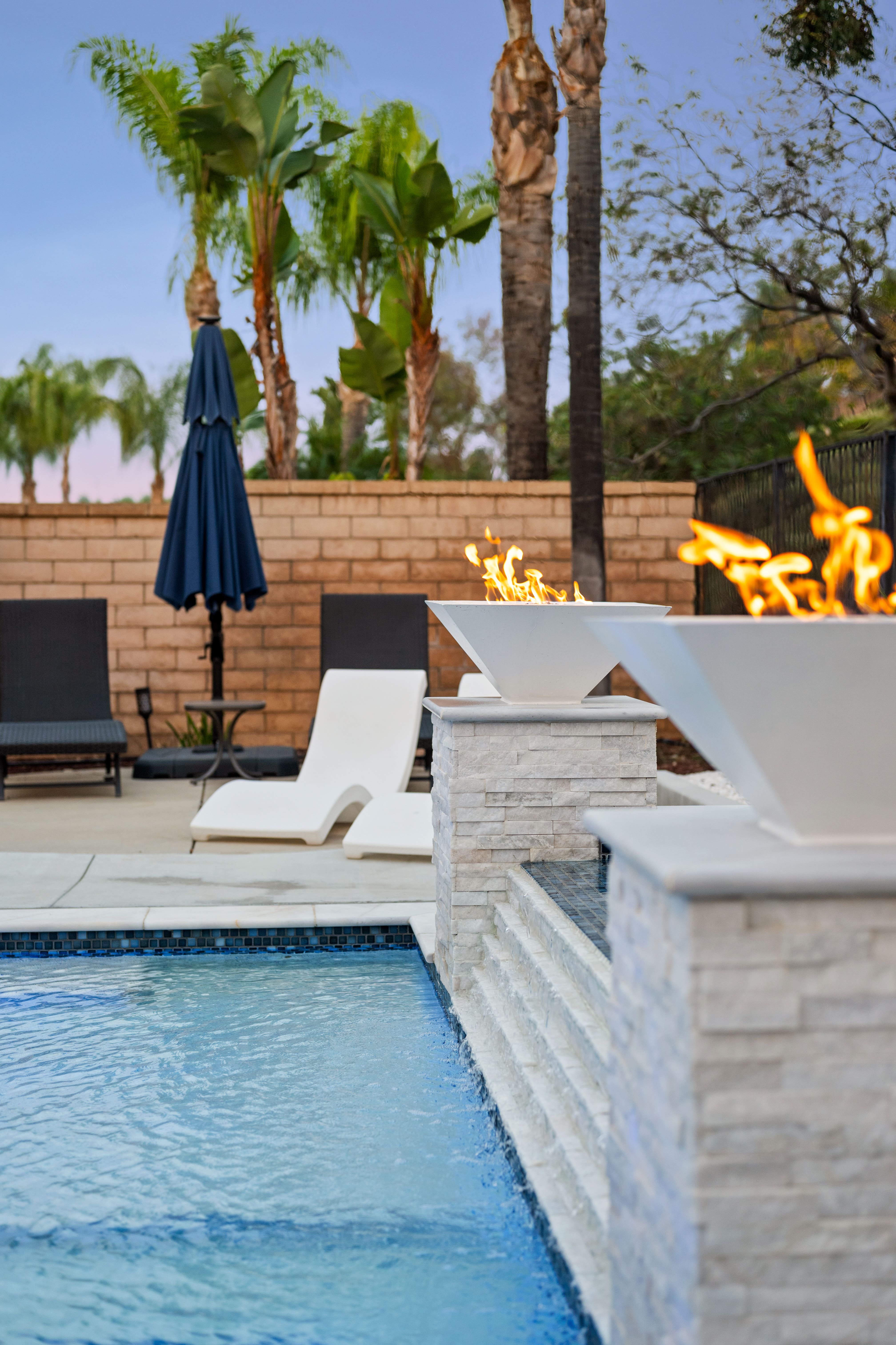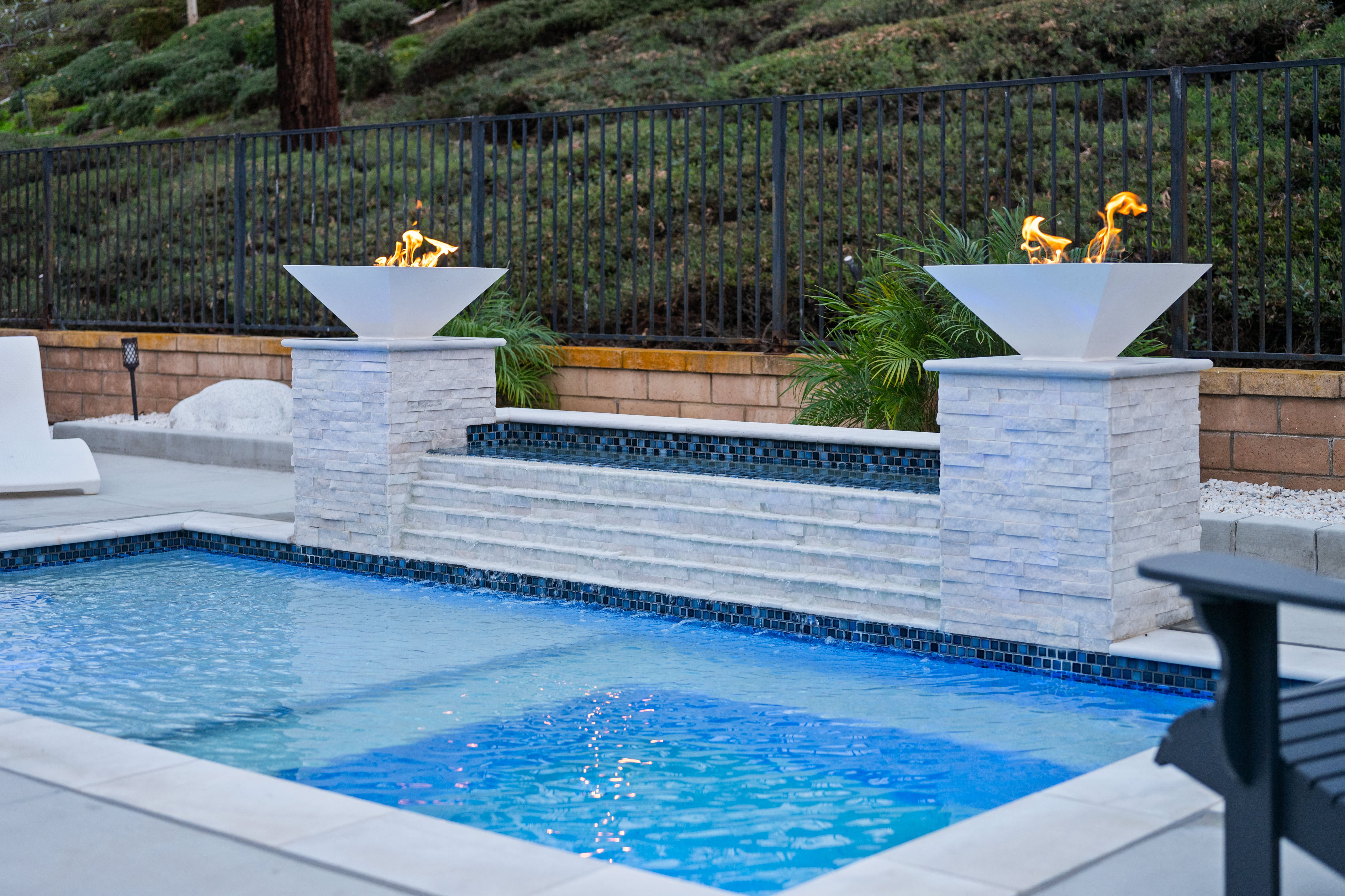 This 8’ x 16’ compact pool is plumbed like a spa—often referred to as a “spool” or swim spa. Essentially, it’s an oversized spa that offers dual functionality: you can enjoy it like a traditional spa or use it as a small “cocktail pool” on hot days when you don’t necessarily want the water heated. The client wanted both a water feature and a fire feature, so we designed a 10’ raised bond beam at 18” high with a tiered spillway. On each side, we built 30” pilasters topped with fire bowls, creating a dramatic focal point that ties the entire vision together. This project delivered exactly what the client wanted—a beautiful, multifunctional water feature that proves you don’t need a large pool to elevate your forever home.