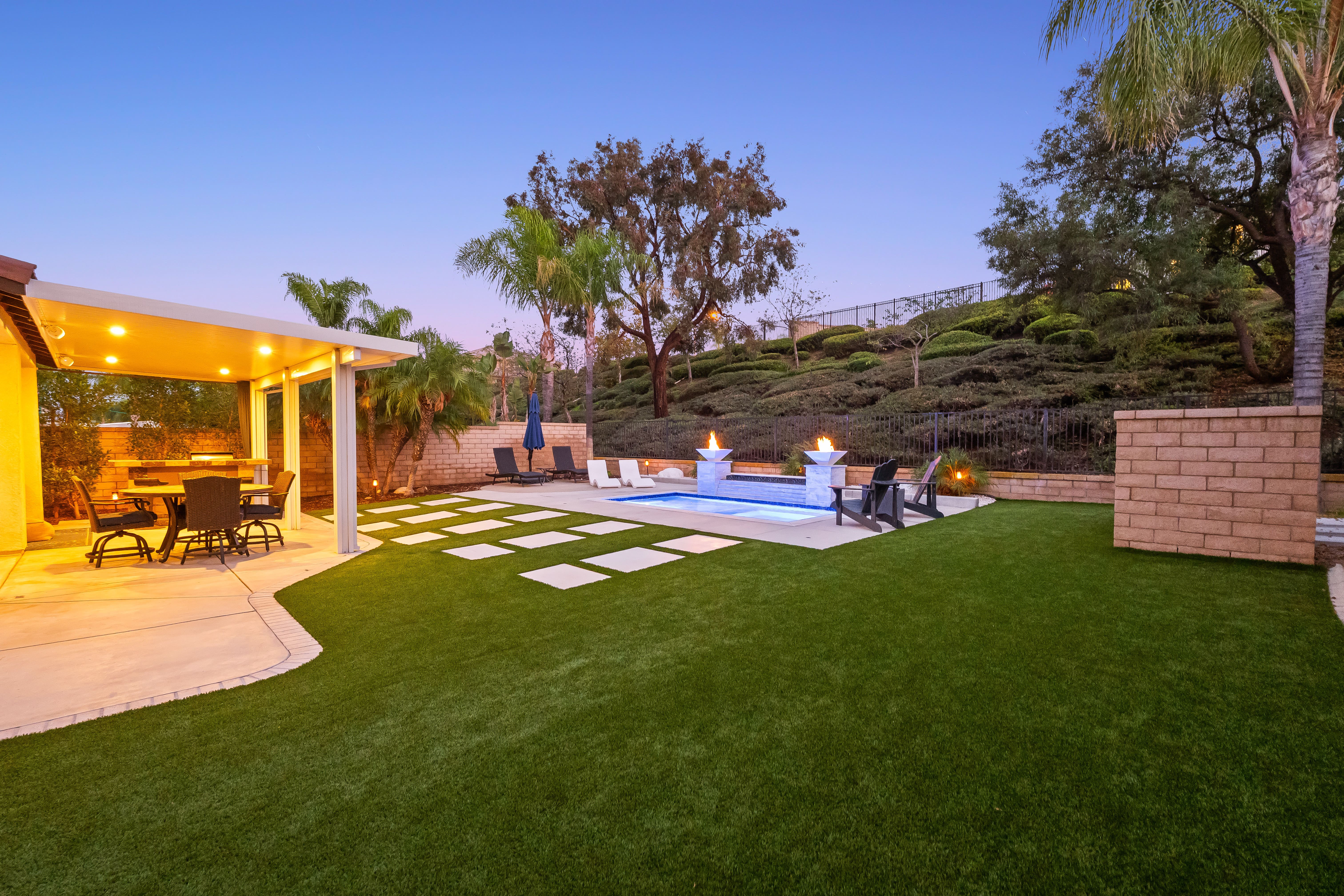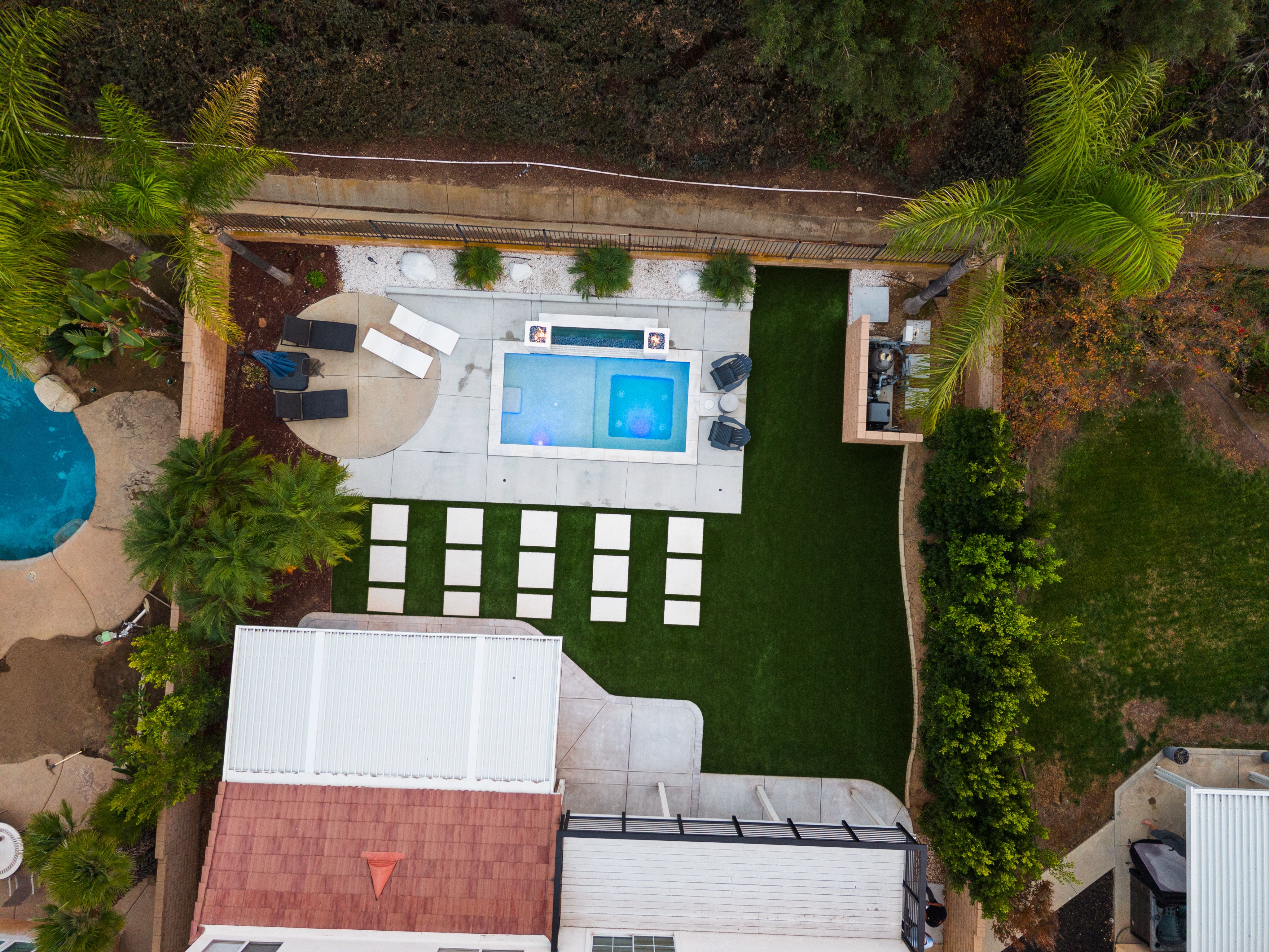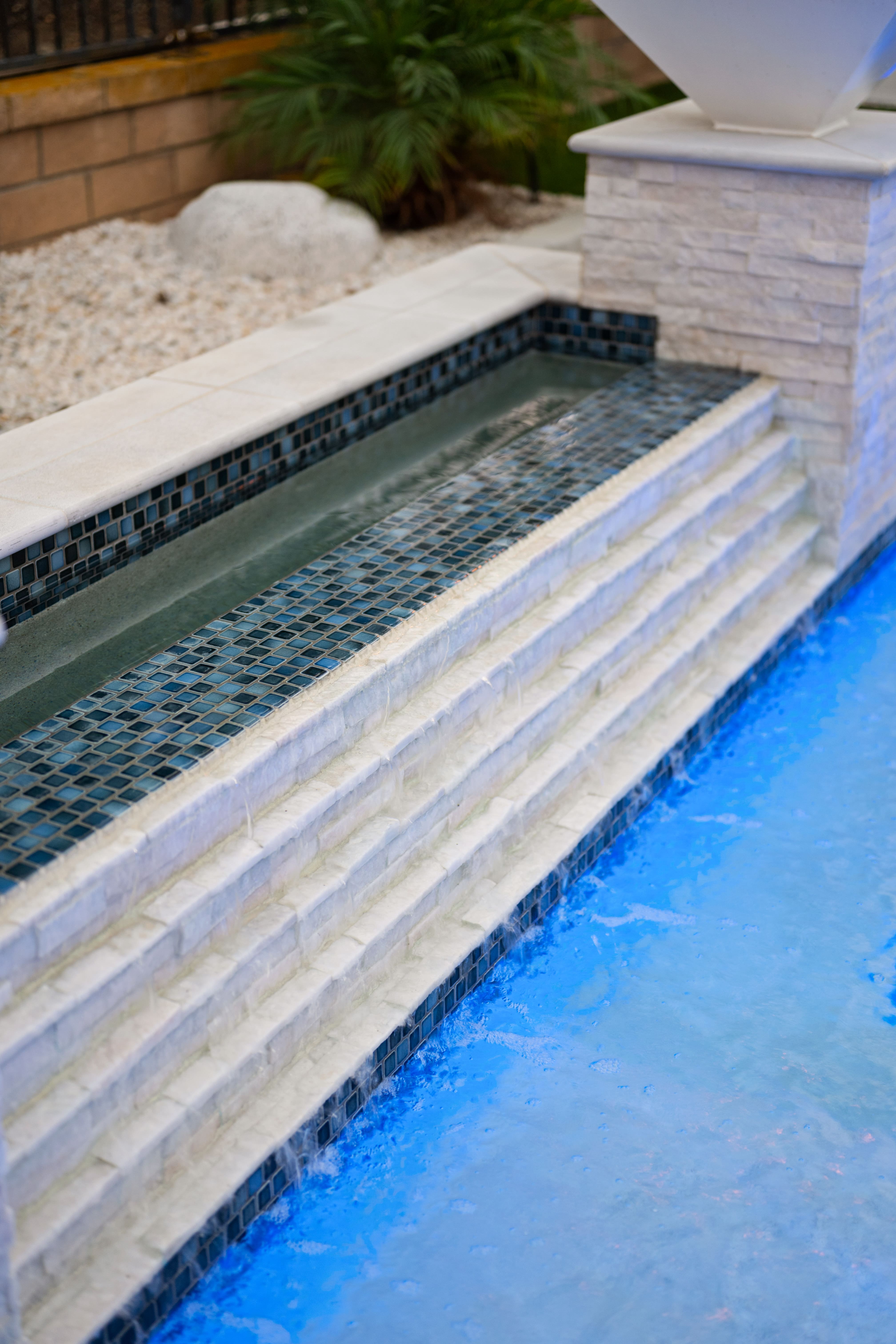 This 8’ x 16’ compact pool is plumbed like a spa—often referred to as a “spool” or swim spa. Essentially, it’s an oversized spa that offers dual functionality: you can enjoy it like a traditional spa or use it as a small “cocktail pool” on hot days when you don’t necessarily want the water heated. The client wanted both a water feature and a fire feature, so we designed a 10’ raised bond beam at 18” high with a tiered spillway. On each side, we built 30” pilasters topped with fire bowls, creating a dramatic focal point that ties the entire vision together. This project delivered exactly what the client wanted—a beautiful, multifunctional water feature that proves you don’t need a large pool to elevate your forever home.