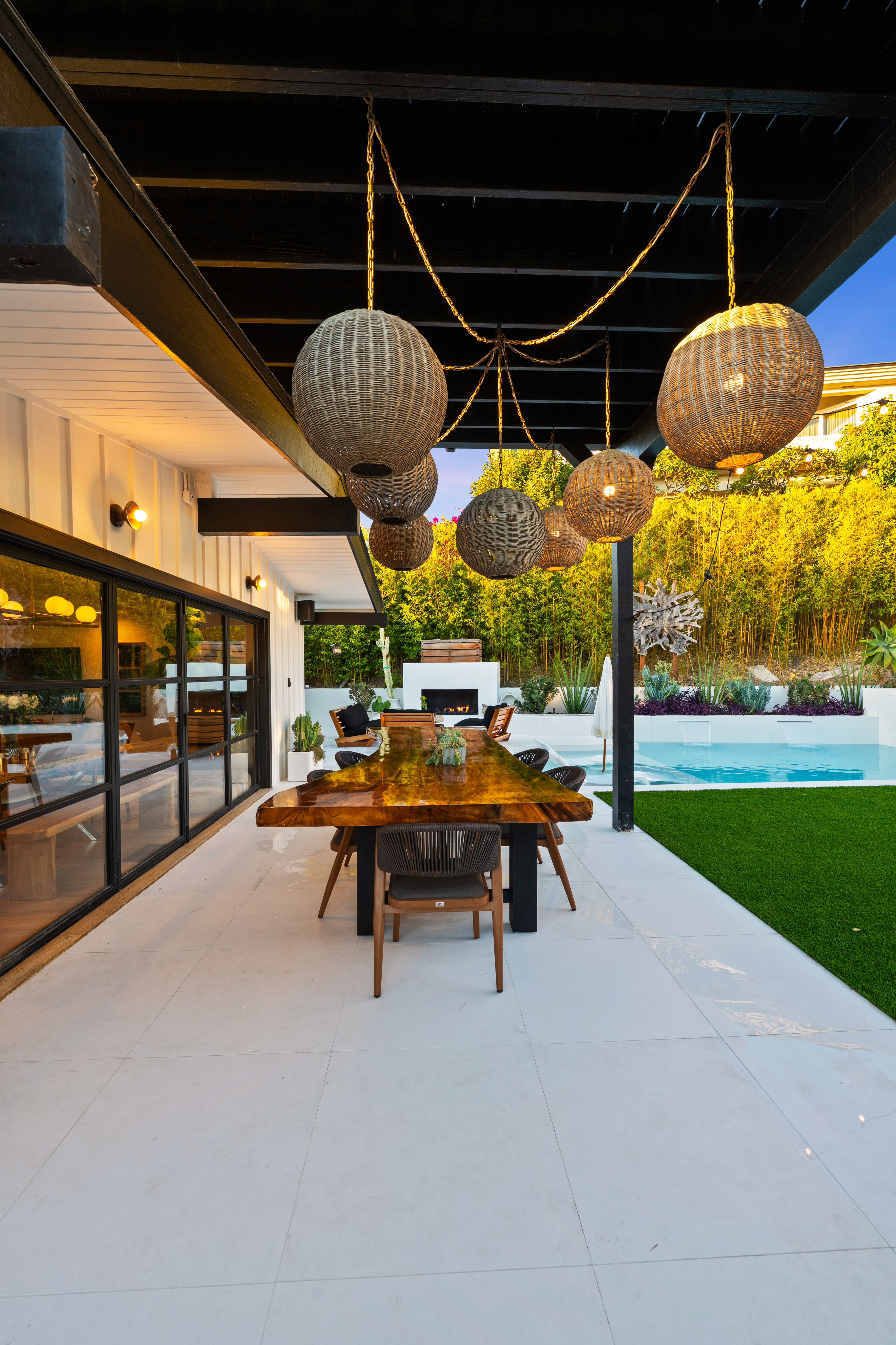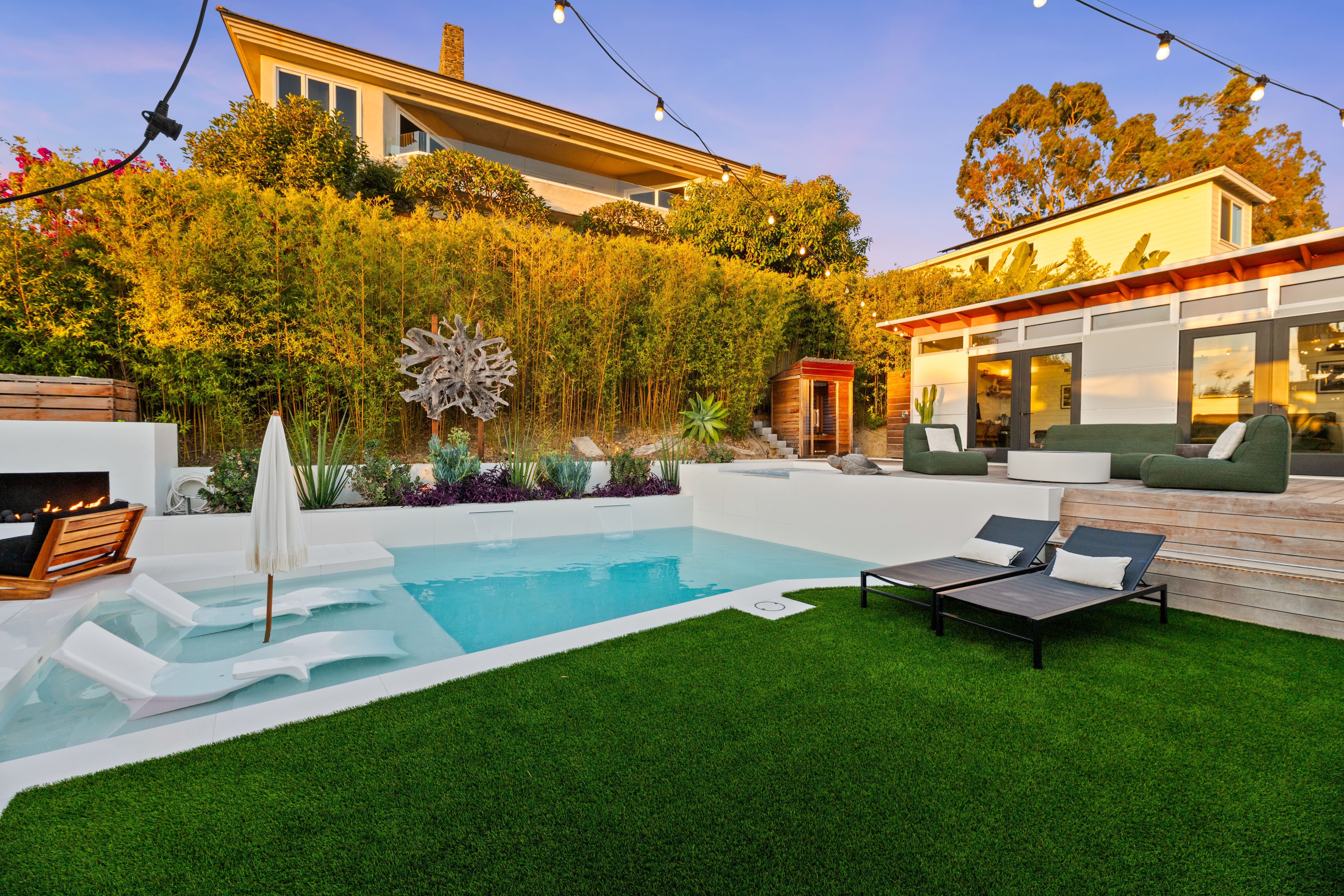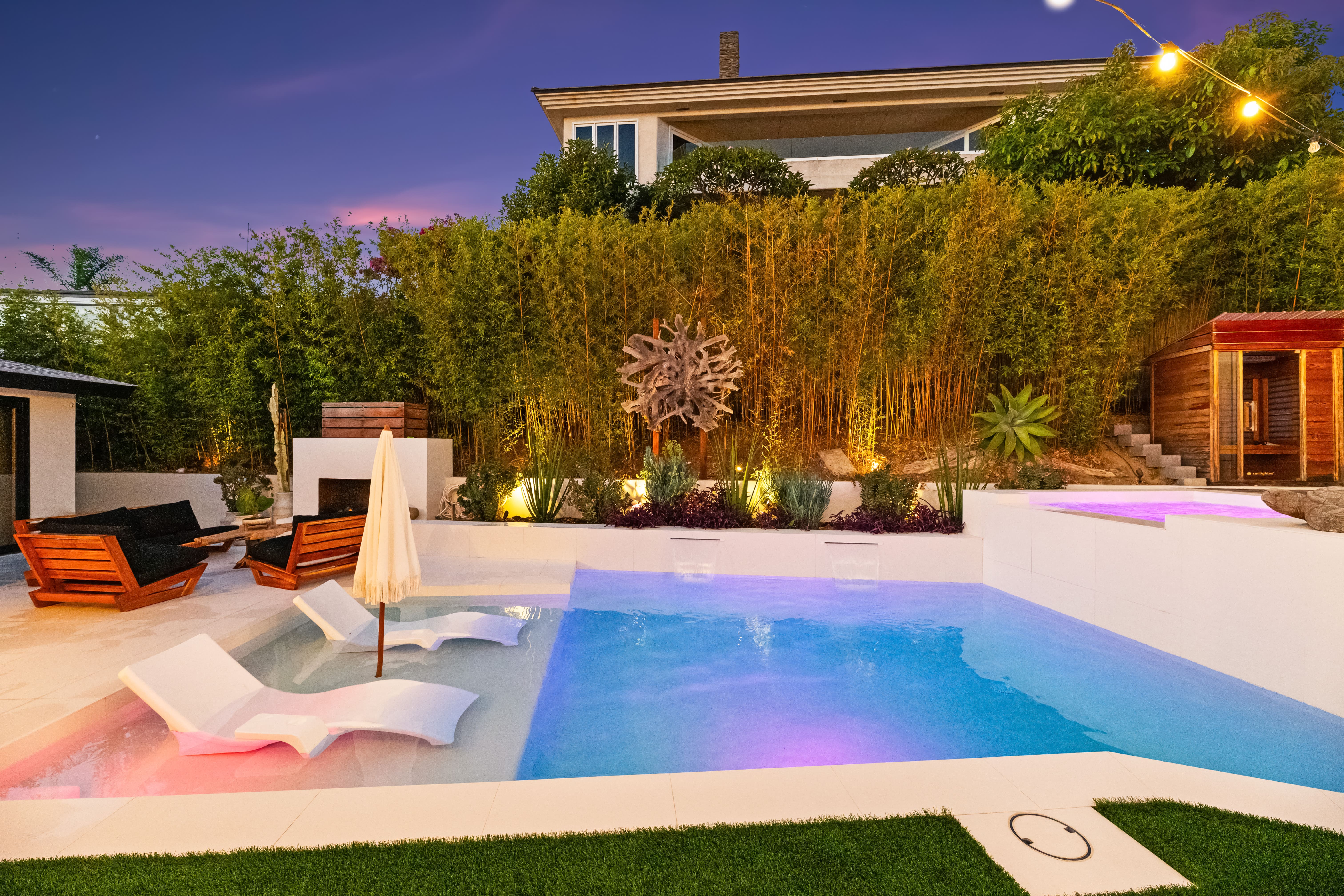 This extensive remodel transformed the entire property—from the front yard and side yard to the backyard. We repainted and refinished the planter walls, guest pool house, fireplace, and outdoor kitchen. New pet-resistant turf was installed, and the backyard received a completely redesigned landscape featuring beautiful, drought-resistant plants with lighting to emulate the vibes the client requested. The pool was fully remodeled, replacing outdated blue chipped tile with sleek, timeless white tile from Bedrosians. The tile was carried all the way up and around the coping and deck, creating a cohesive, high-end finish that elevates the entire outdoor space.
