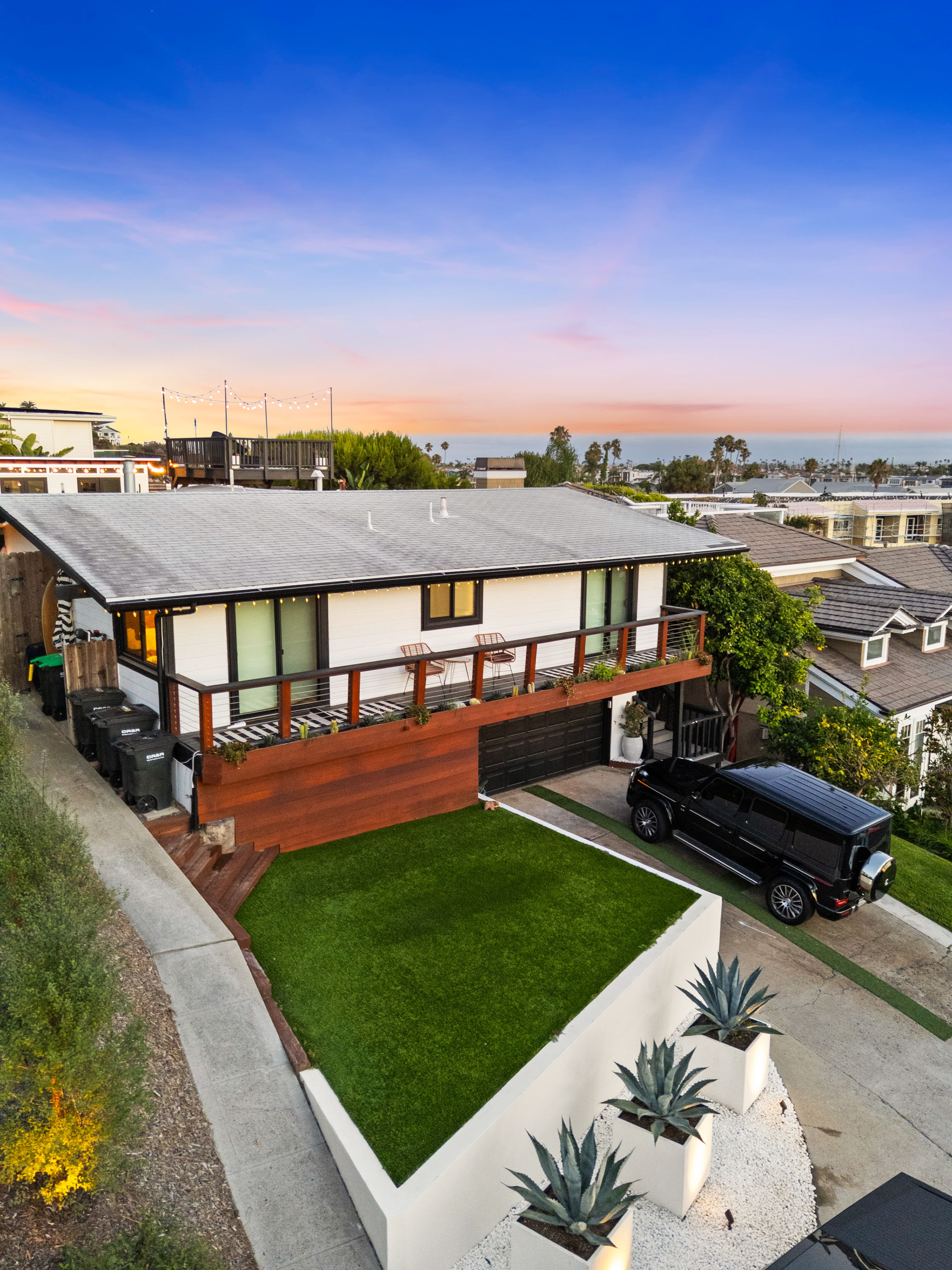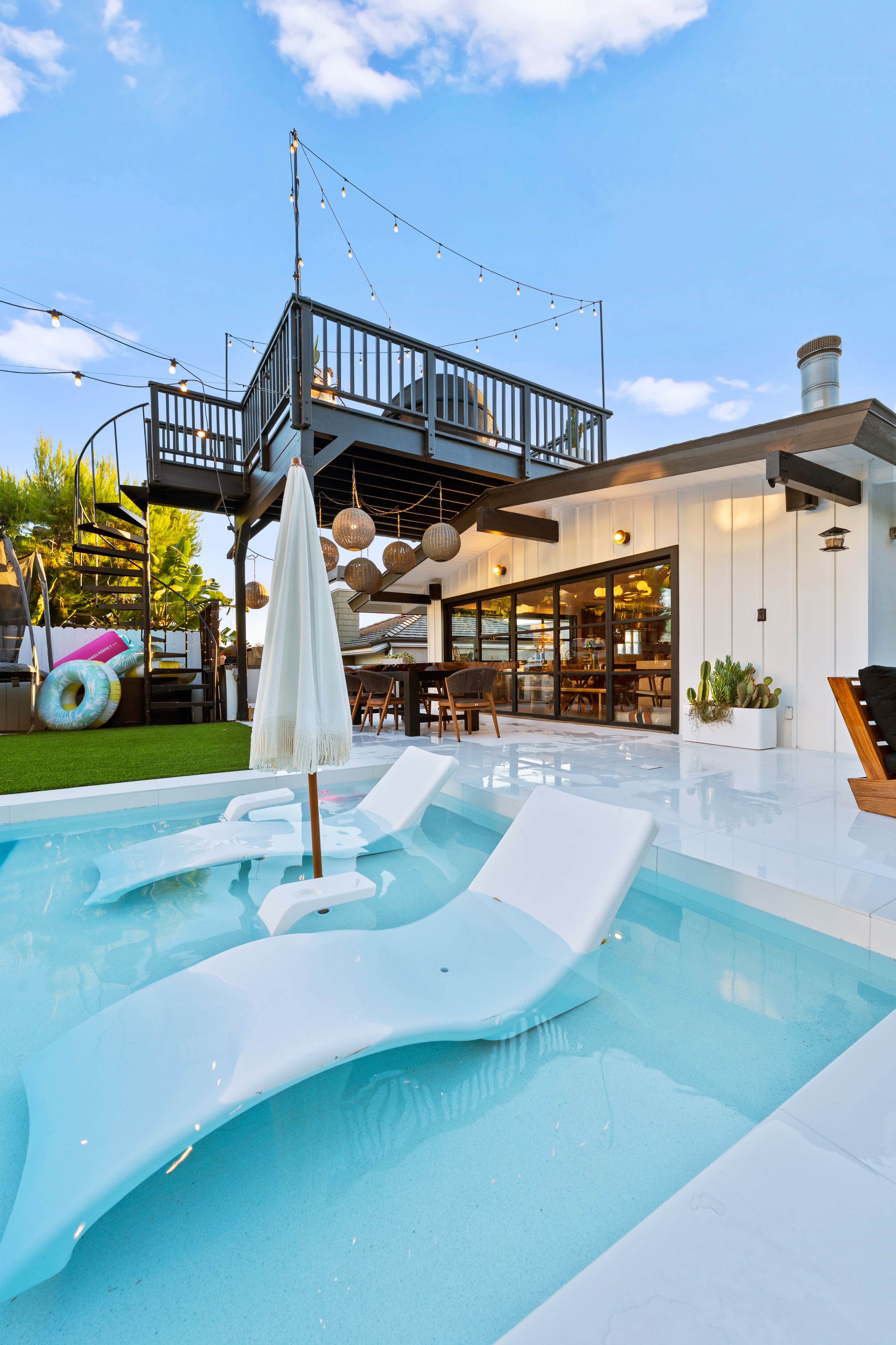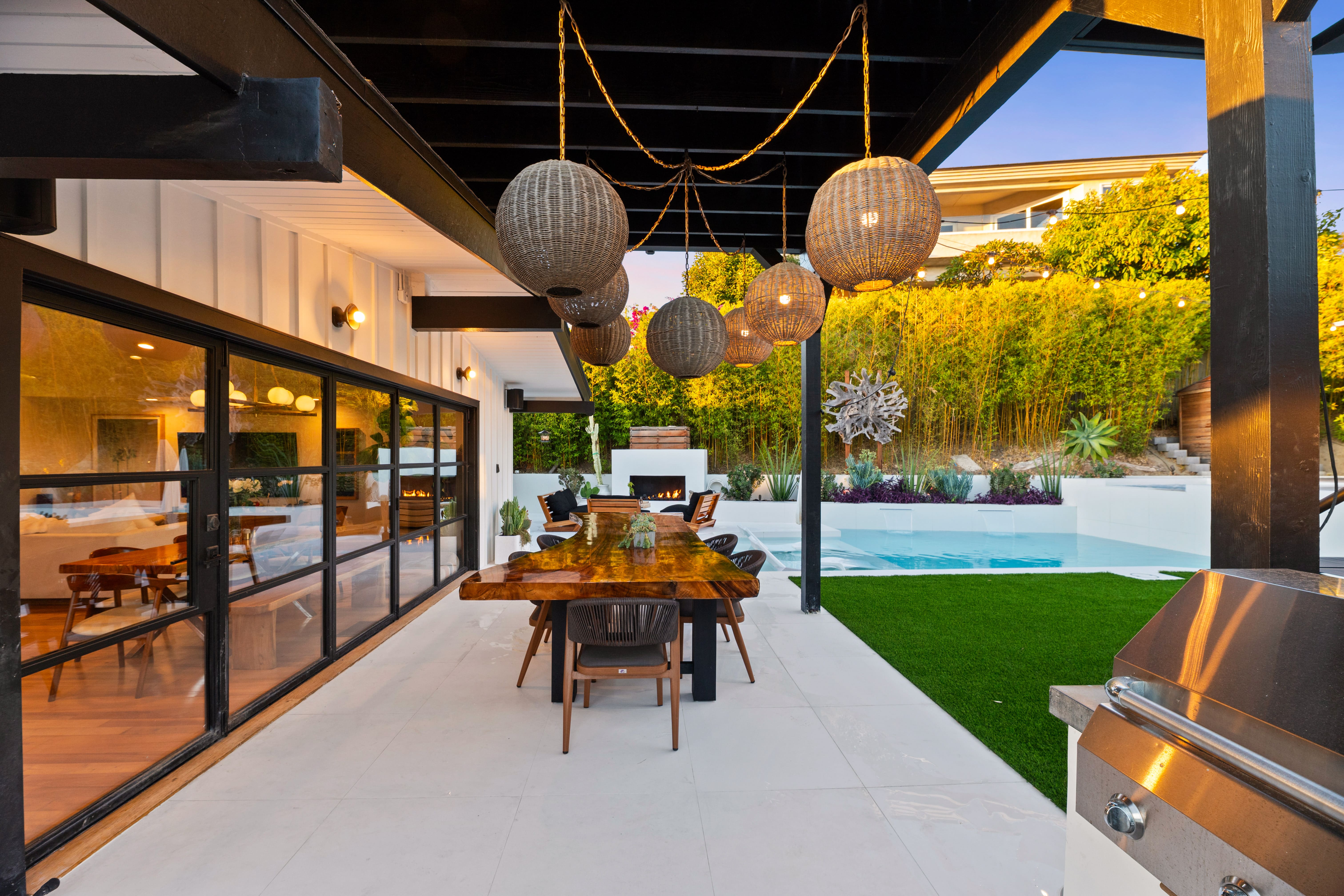 This extensive remodel transformed the entire property—from the front yard and side yard to the backyard. We repainted and refinished the planter walls, guest pool house, fireplace, and outdoor kitchen. New pet-resistant turf was installed, and the backyard received a completely redesigned landscape featuring beautiful, drought-resistant plants with lighting to emulate the vibes the client requested. The pool was fully remodeled, replacing outdated blue chipped tile with sleek, timeless white tile from Bedrosians. The tile was carried all the way up and around the coping and deck, creating a cohesive, high-end finish that elevates the entire outdoor space.