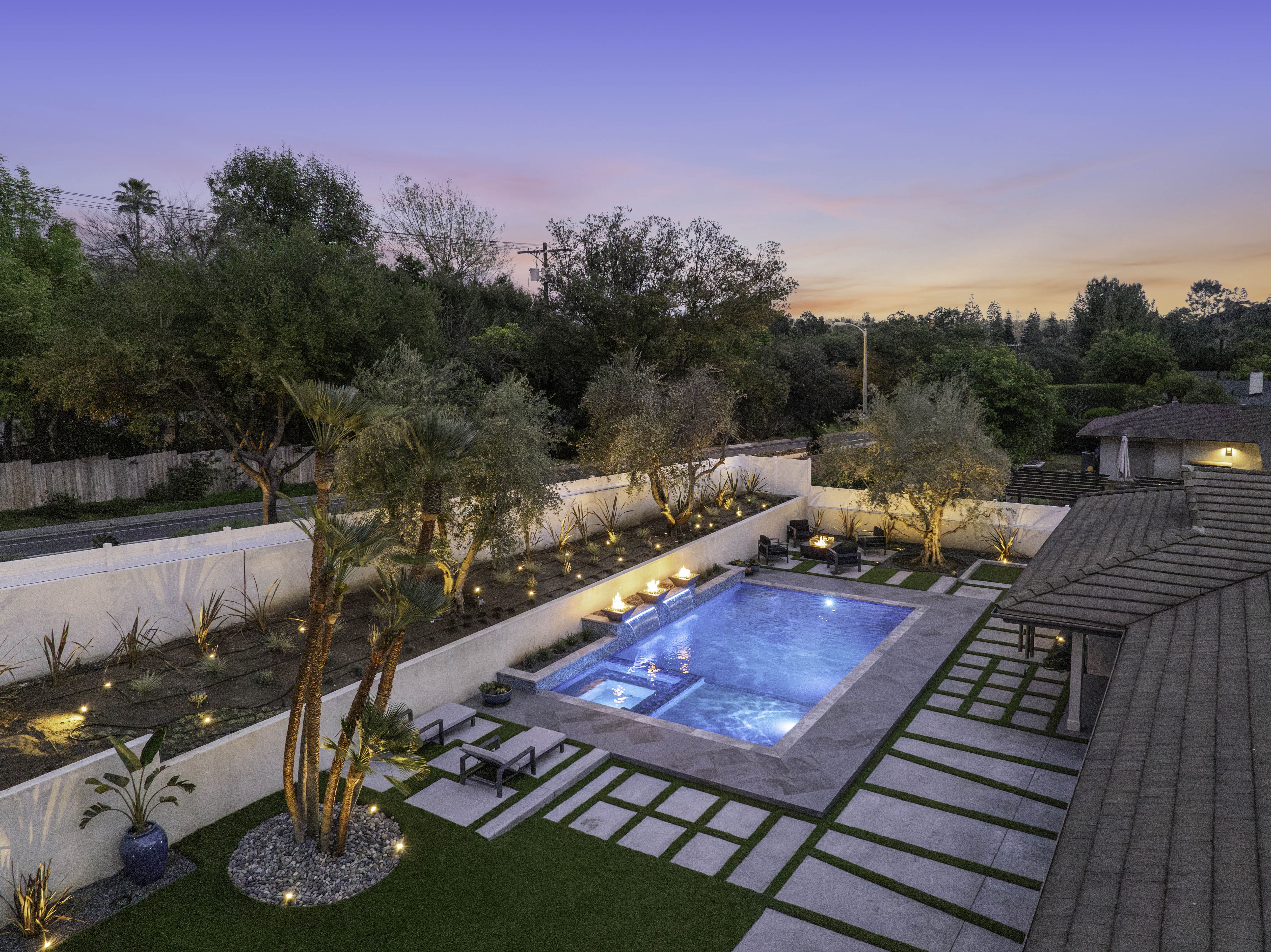 This project features a 17’ x 30’ pool paired with a 6’ x 6’ spa, along with an expansive 10’ x 10’ Baja step for ample lounging space. The design includes a raised bond beam running the full length of the back wall, accented with fire bowls and sheer descents to bring together water, fire, and architectural elements for a true high-end resort feel.